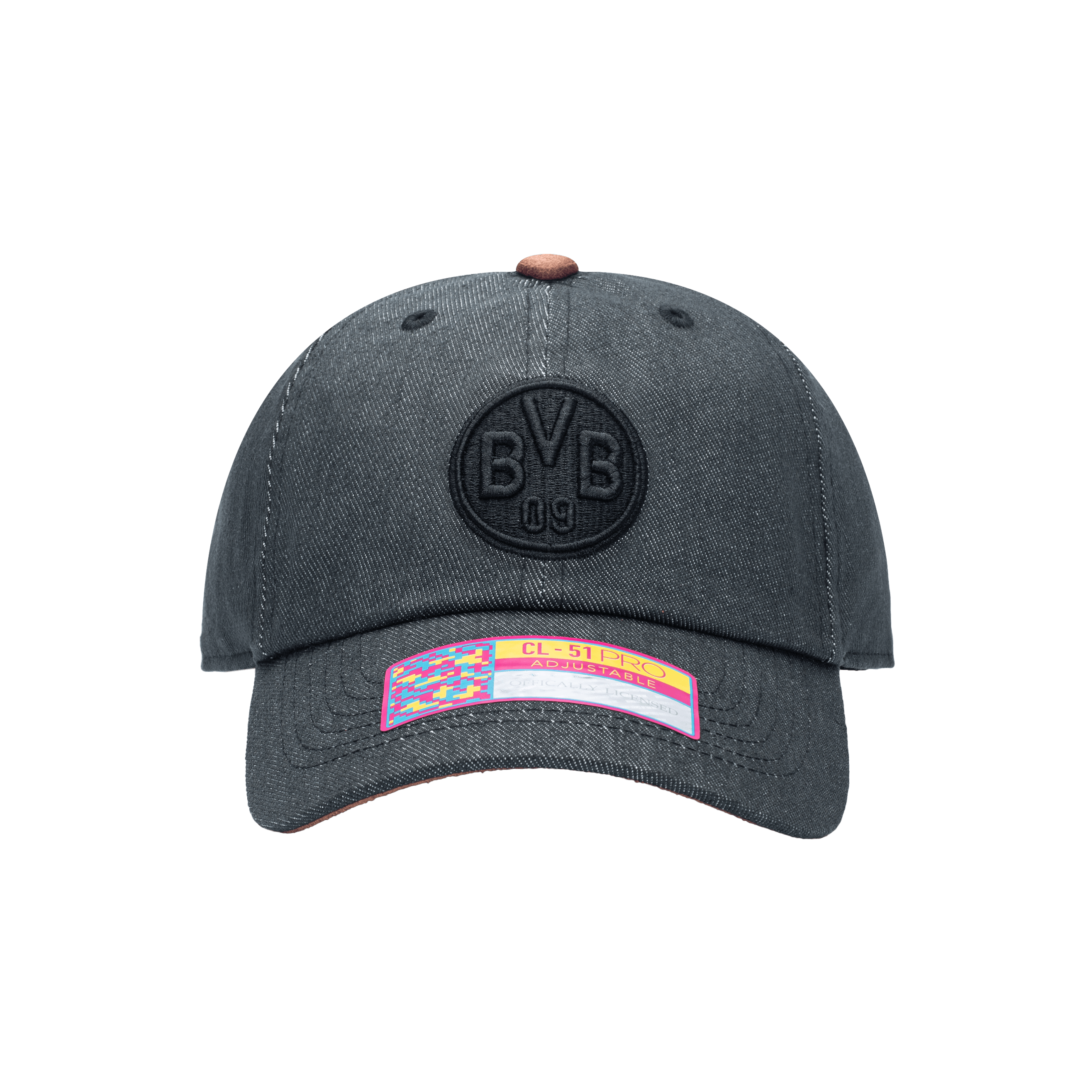 This Borussia Dortmund officially licensed hat features team logo 3D embroidery on front and embroidery on back. The hat is made of 65% Cotton, 35% Polyester and has a contrast PU underpeak, top button and strapback. Support your team in this 6-panel low crown, unconstructed, curved peak hat!