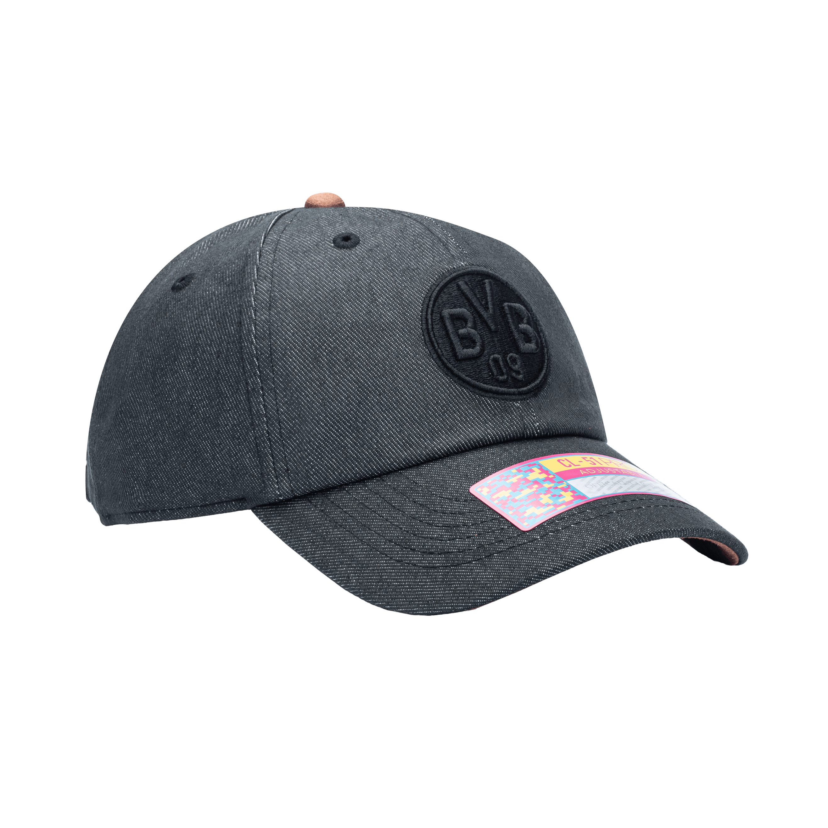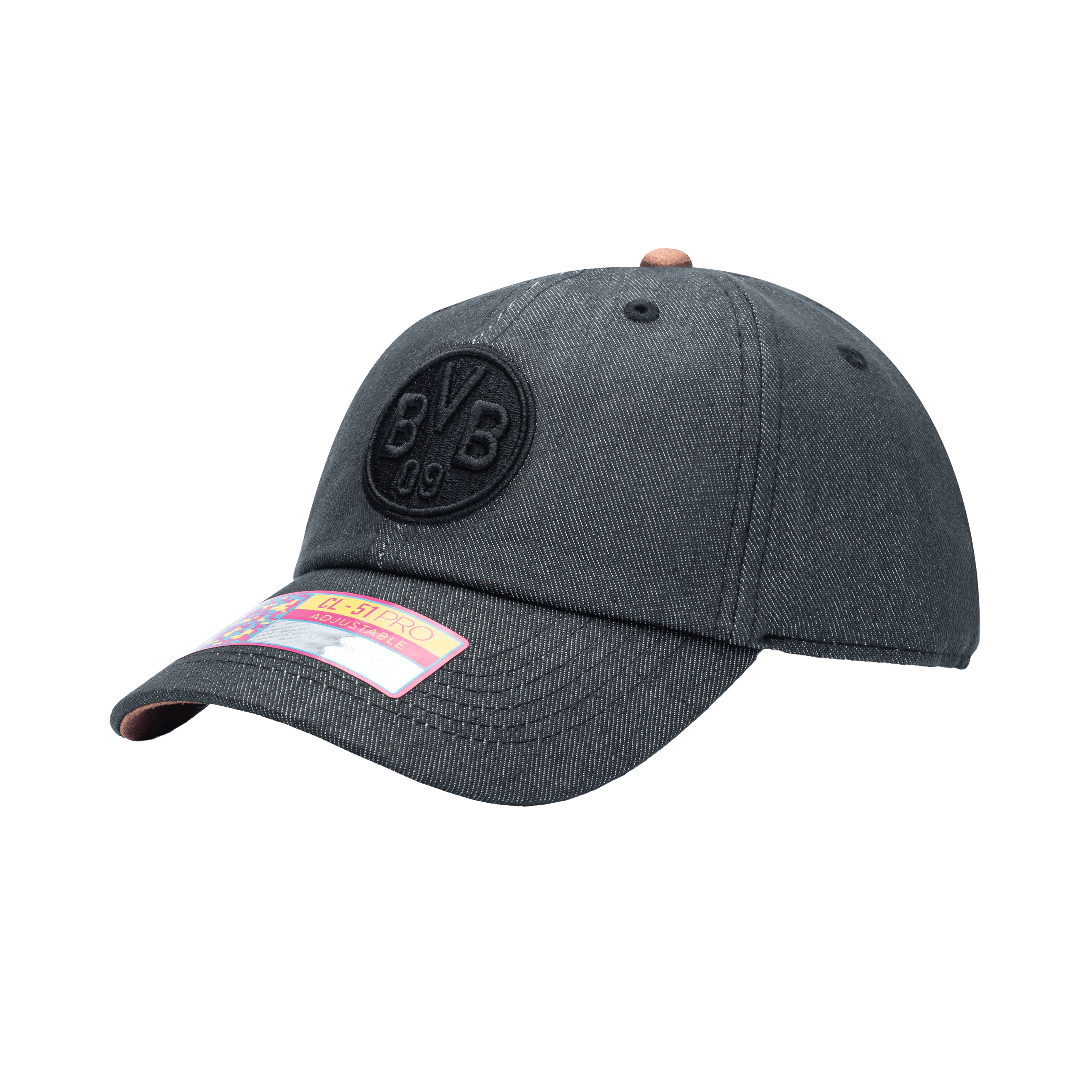 Side view of the Borussia Dortmund Pegasus Classic hat with low unstructured crown, curved peak brim, and buckle closure, in black.