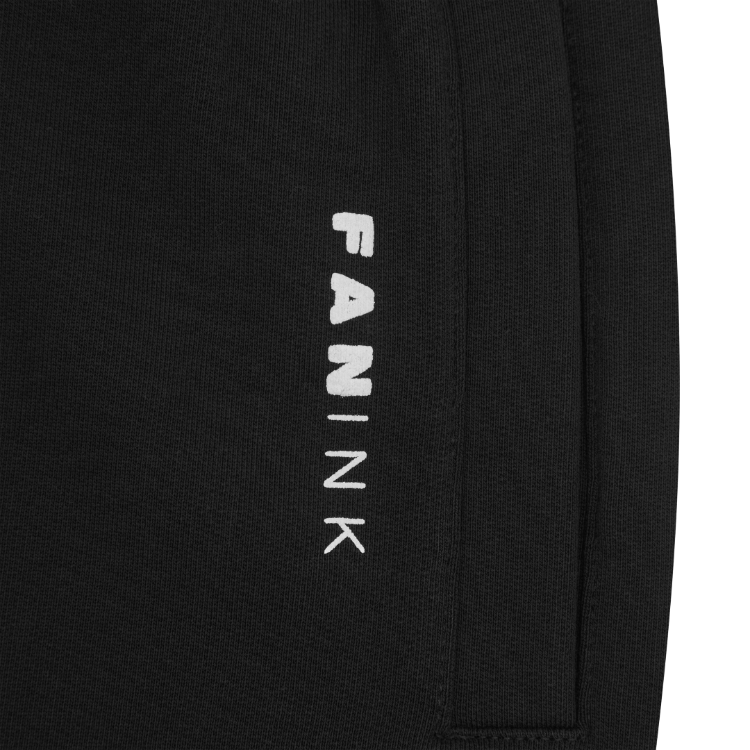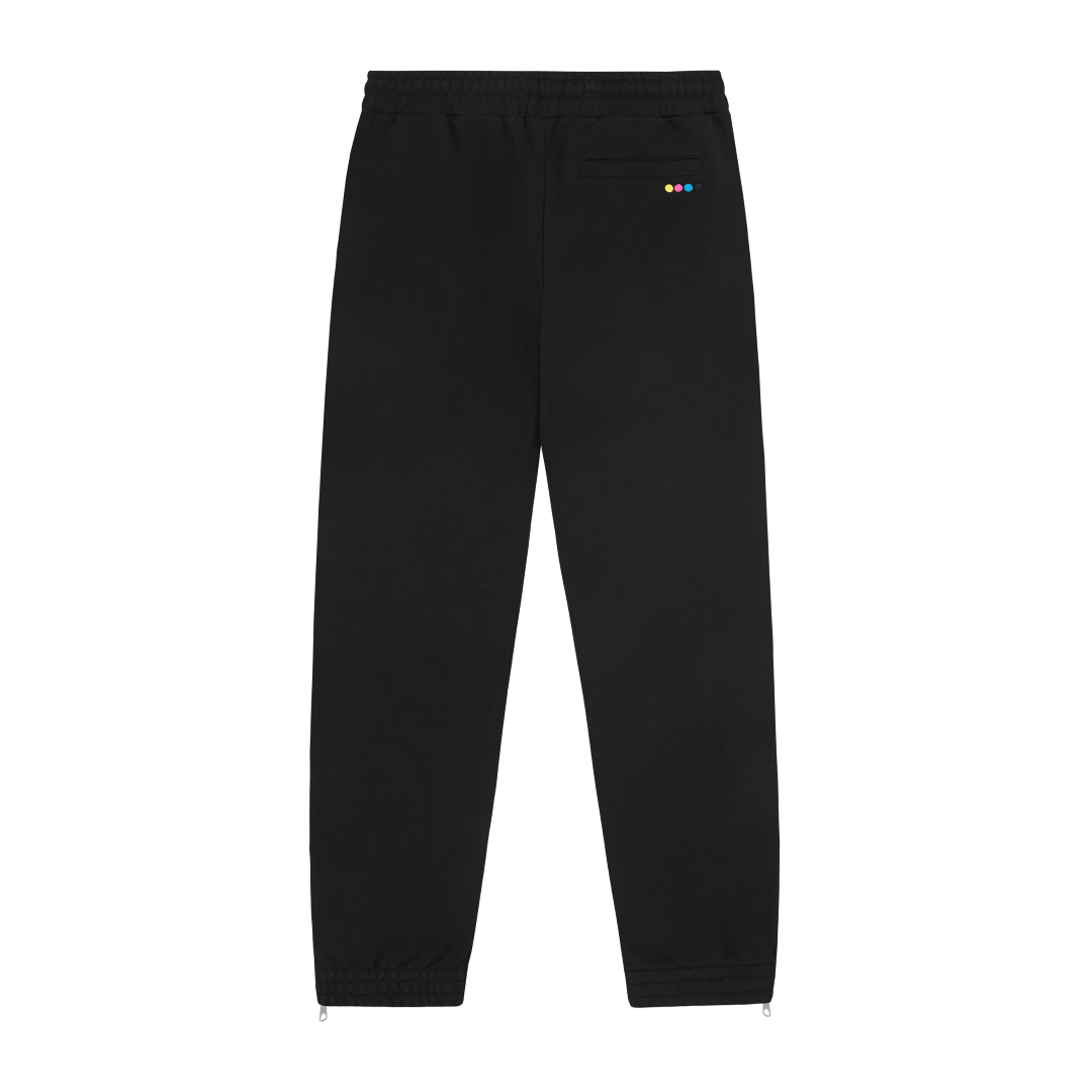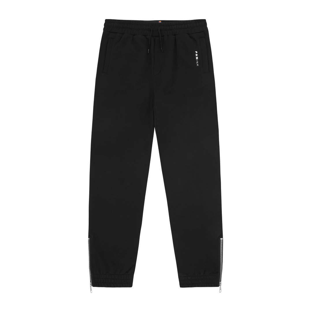Elasticized waist with adjustable drawstring. Elasticized cuffs with zipper detail. Fan Ink screen printed on left pocket. Fan Ink colours embroidered on back pocket. Made in Portugal.