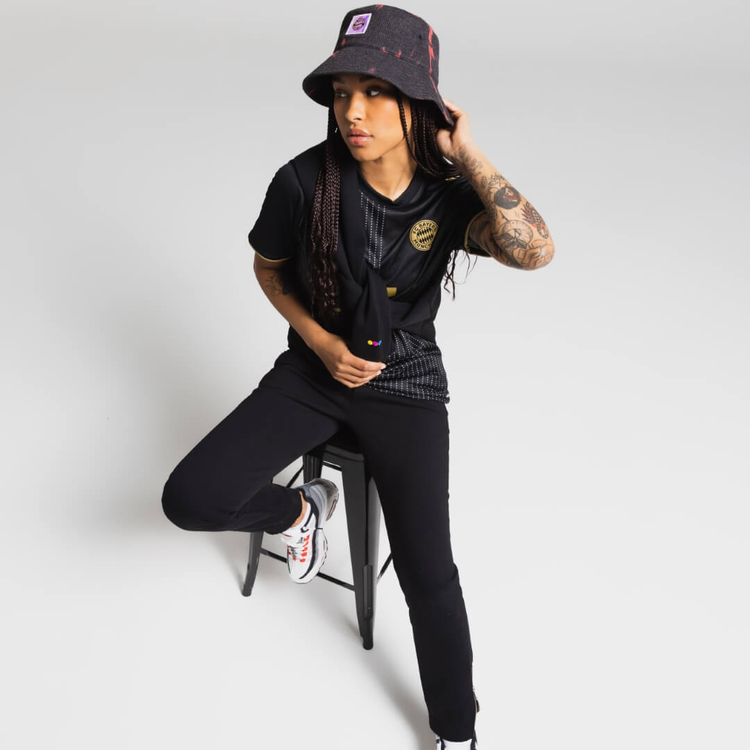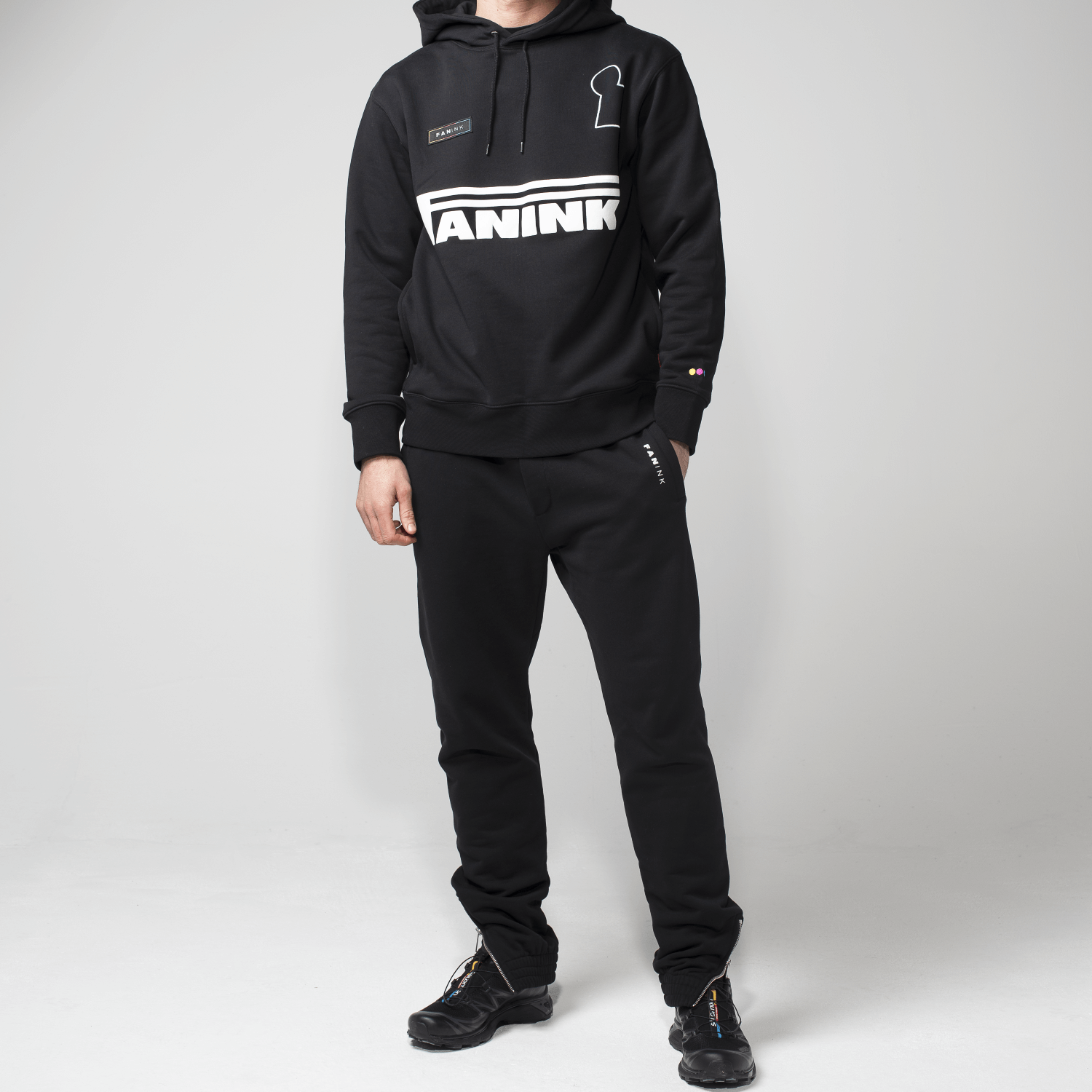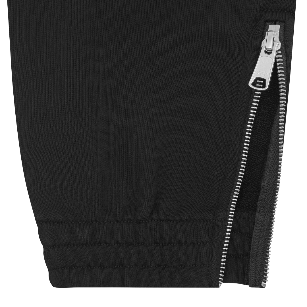 Elasticized waist with adjustable drawstring. Elasticized cuffs with zipper detail. Fan Ink screen printed on left pocket. Fan Ink colours embroidered on back pocket. Made in Portugal.