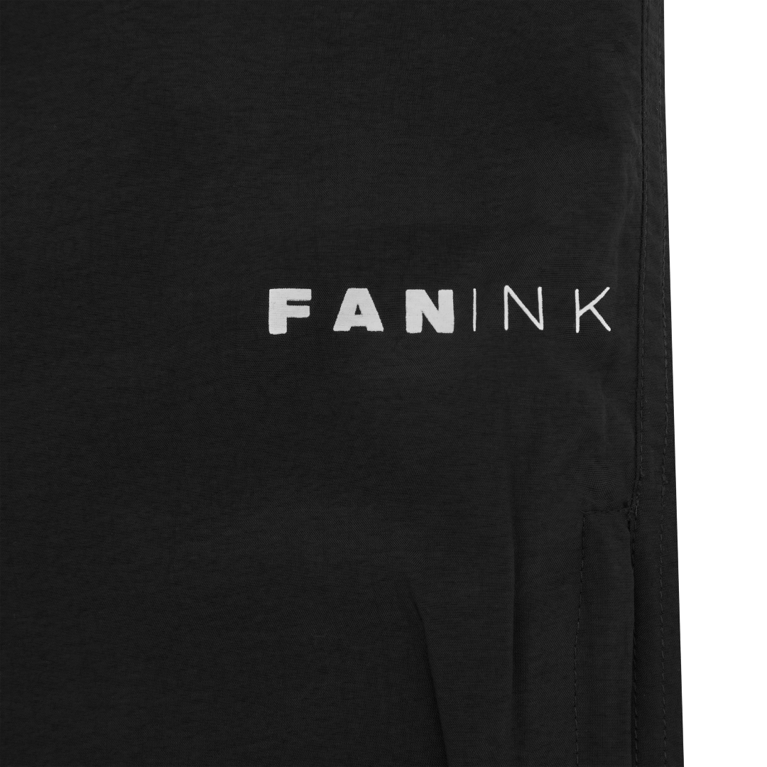 Elasticized waistband. 2 waist pockets with contrast piping. Fan Ink screen printed at left leg. Elasticized cuffs with invisible zipper detail. Made in Portugal.