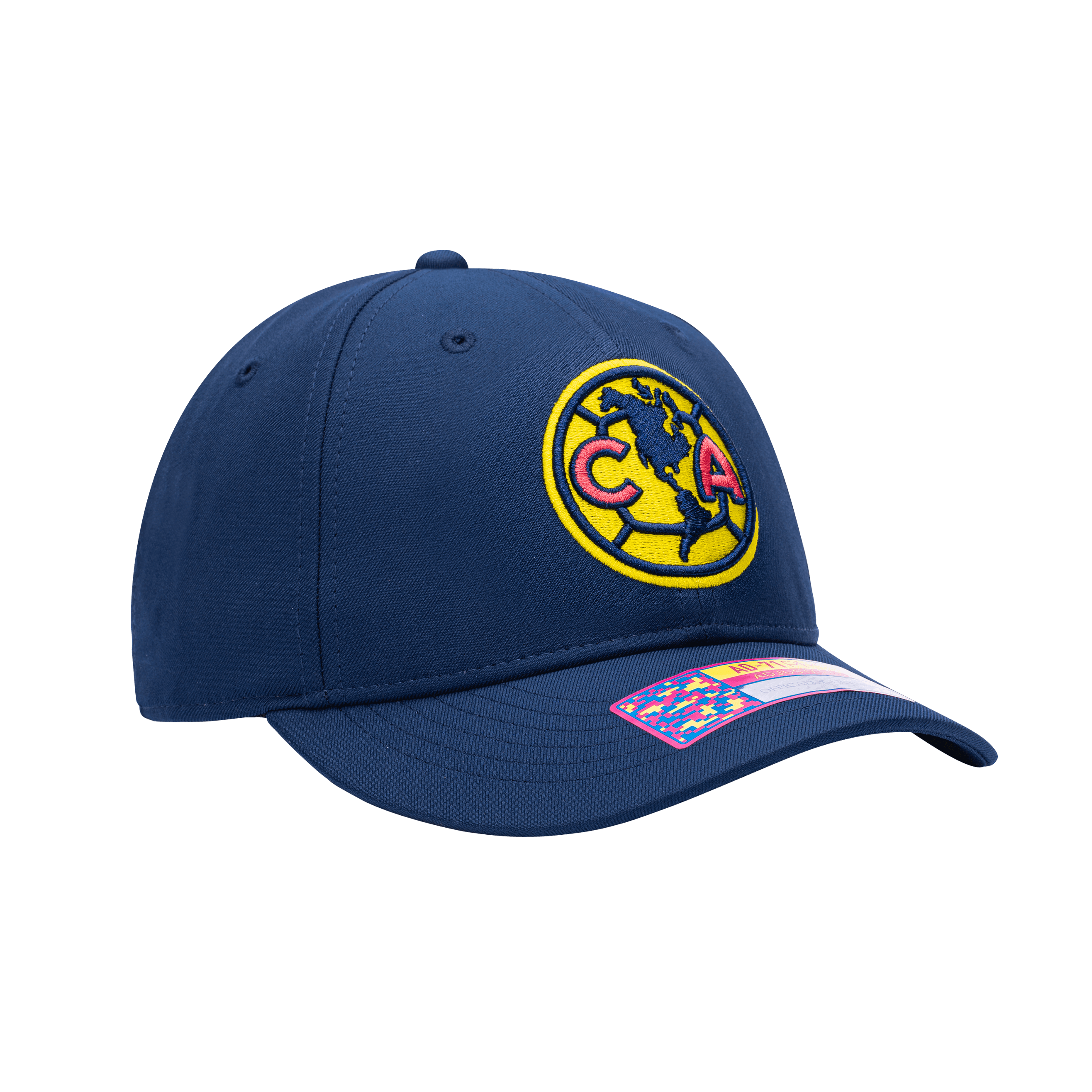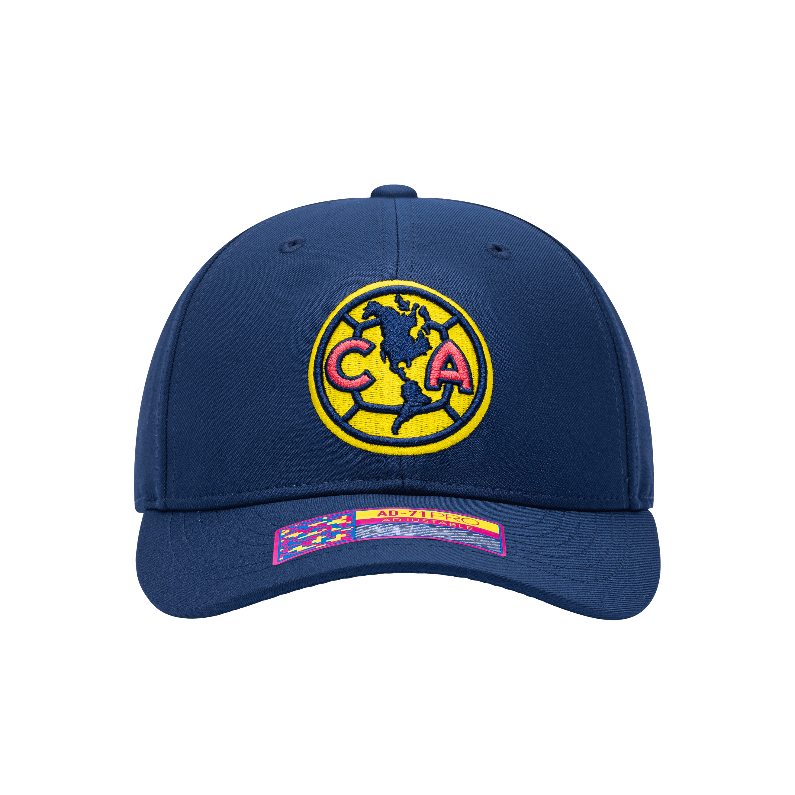 Front view of the Club America Standard Adjustable hat with mid constructured crown, curved peak brim, and slider buckle closure, in Navy.