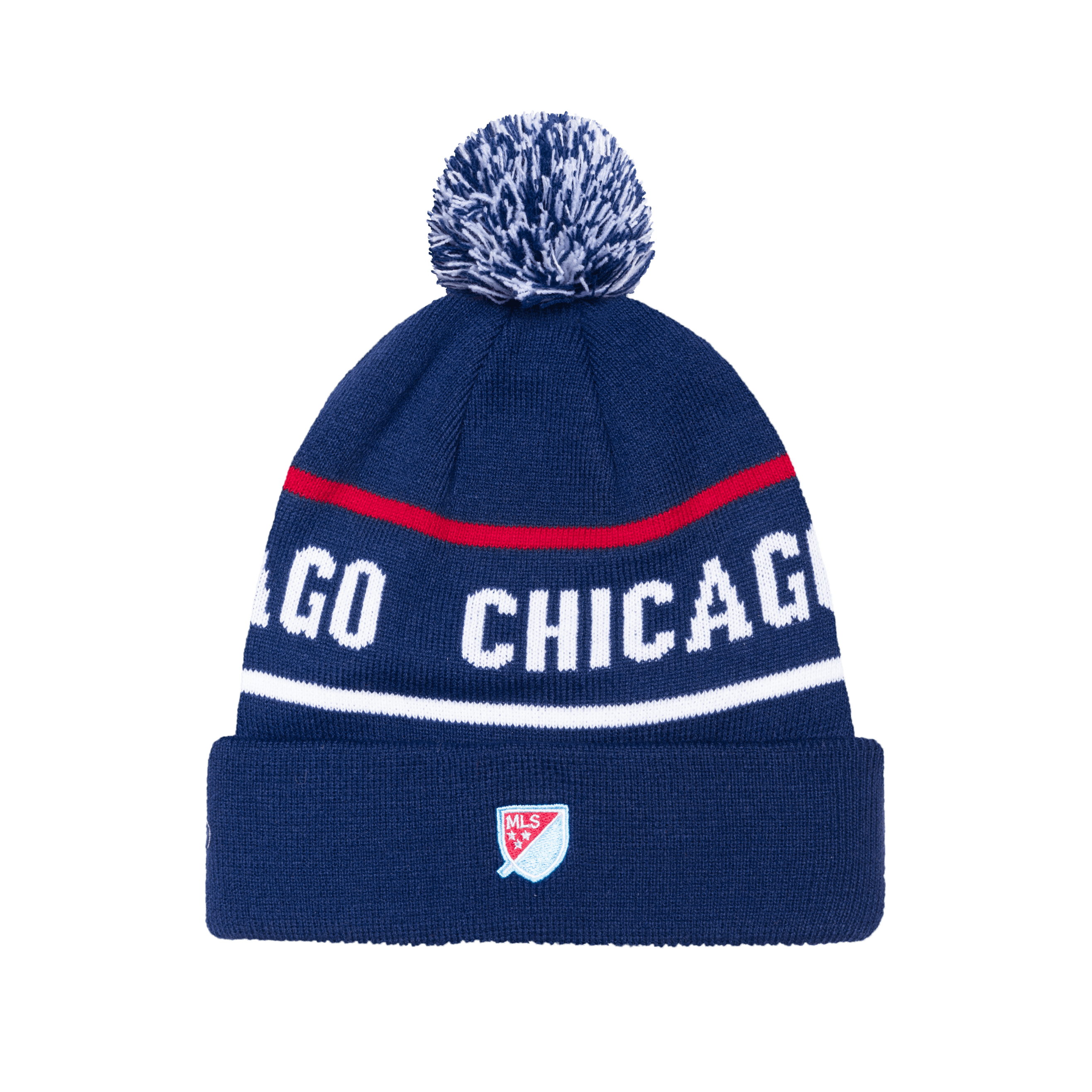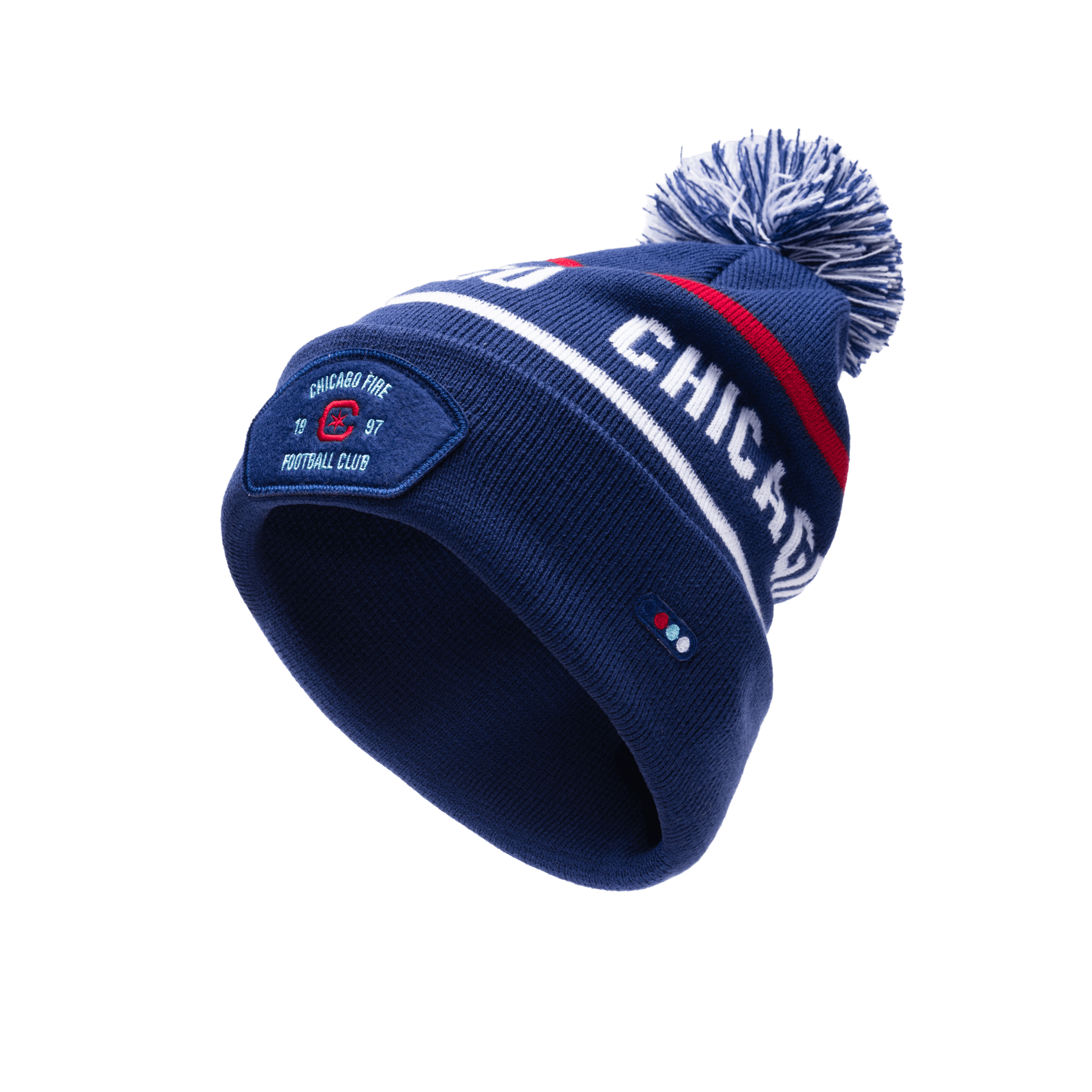 Knit-In 6 Dart Beanie with club branding. Front club patch and MLS shield in club colours on back. Fan Ink signature 4 dots embroidered on side.