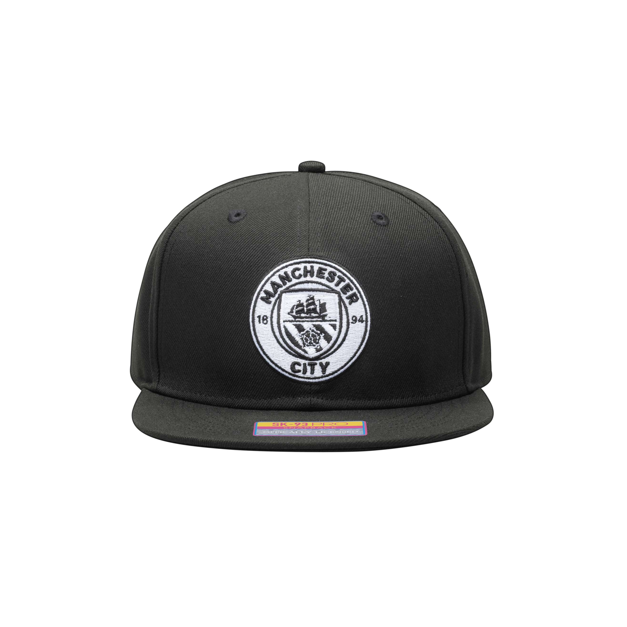 The Manchester City Hit Snapbackhat lets you show your support for your team in style! This Hit hat features a front 3D embroidery of the team logo as well as the team name embroidery on the back. The team logo and name are embroidered in white to contrast the black crown of the hat. The hat has a high crown and a flat peak.